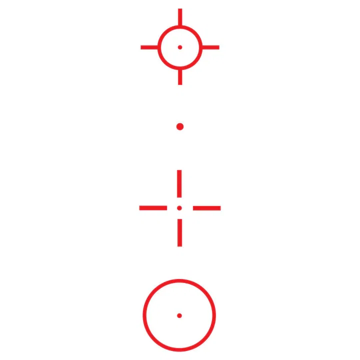 | Hårkors | 4 mönster - 5 MOA-prick, 3 MOA-prick med 50 MOA cirkel, 3 MOA-prick med 50 MOA hårkors, 3 MOA-prick med 30 MOA cirkel/hårkors |