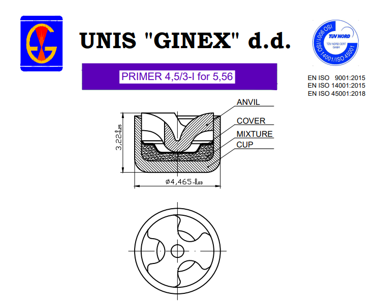 GINEX Primer 4,5/3-1 for 5,56 är en högpresterande Boxer-tändhatt (Small Rifle) särskilt utvecklad för omladdning av 5,56x45mm NATO och .223 Remington. Denna modell är konstruerad för att möta strikta militära krav, vilket innebär en något hårdare kopp (tjocklek ca 0,68 mm) för att förhindra oavsiktlig antändning (slam-fires) i halvautomatiska vapen