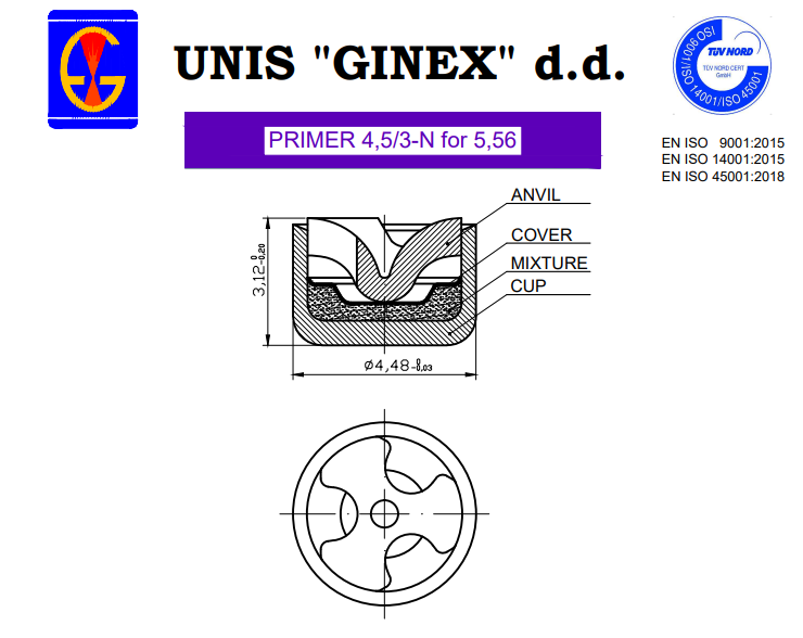 GINEX Primer 4,5/3-N for 5,56 är en robust Boxer-tändhatt (Small Rifle) som är specifikt optimerad för 5,56x45mm NATO och andra högtryckskalibrar. Till skillnad från standardmodellen för civilt bruk (P3) har N-versionen en tjockare kopp på cirka 0,60–0,62 mm för att tåla det högre trycket i 5,56-ammunition och minimera risken för genomslag (piercing) eller oavsiktlig antändning i halvautomatiska vapen.