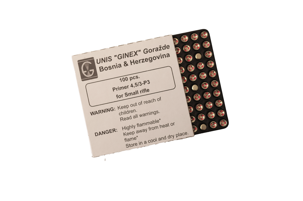 GINEX Primer 4,5/3-P3 för Small Rifle är en tändhatt designad för smågevärspatroner. Den erbjuder pålitlig och konsekvent prestanda, vilket gör den idealisk för både kommersiell användning och hobbyister. Varje förpackning innehåller 100 tändhattar och produkten är perfekt för omladdning av ammunition, med hög säkerhet och effektivitet. 4o mini